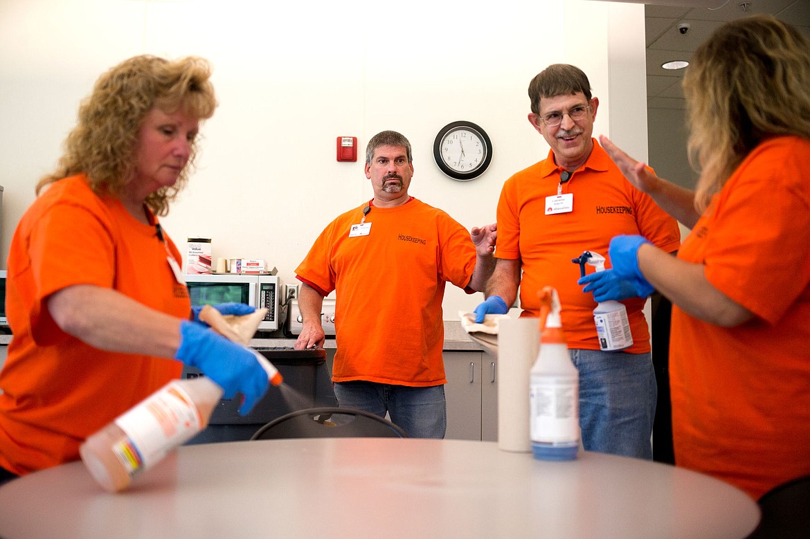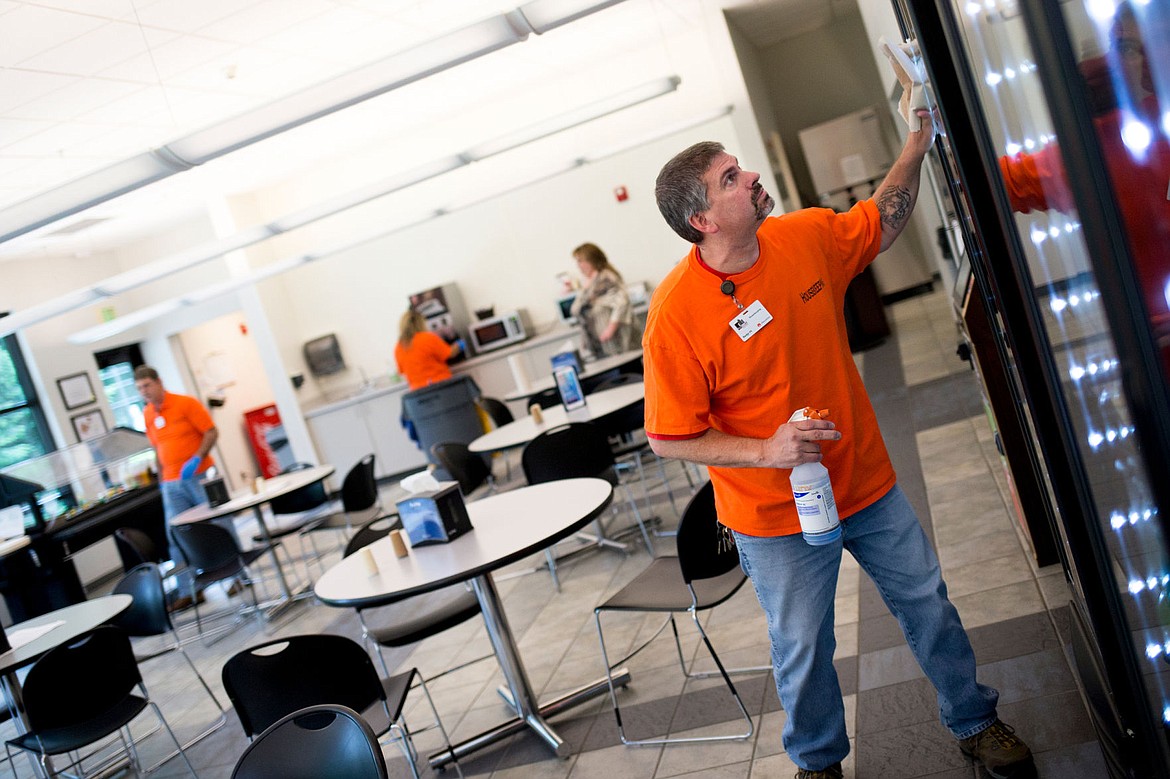 COEUR d'ALENE — A storm of orange work shirts rolls through the hallway at Alliance Data, dotted with bright blue gloves amid wheeling gray trash cans and fresh cleaning supplies.