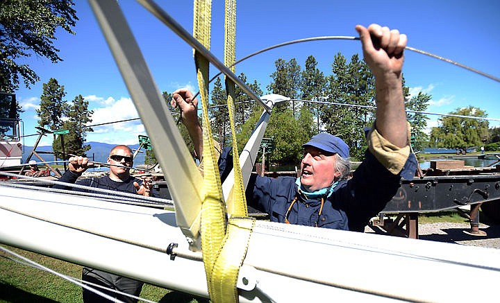 Shipwright Jon Derry helps with the mast rigging as the crew from Harmon Crane begins to lift the mast on Wednesday, June 15, at the Flathead Lake Lodge in Bigfork. (Brenda Ahearn/Daily Inter Lake)
