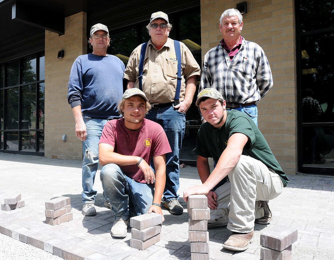 Alpine Landscaping's Justin Thomas, left bottom row, Austin Gimnich, Jerry Abell, Dave Reynolds and Bruce Altenberg donated labor and materials to build the patio. (Aaric Bryan/Daily Inter Lake)