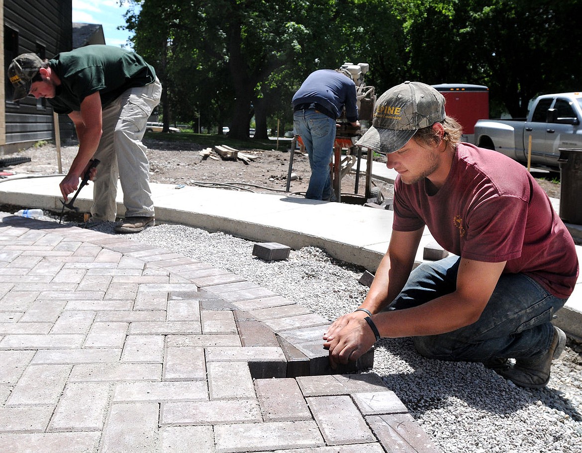 Justin Thomas places bricks for a patio on the west side of the South Campus Building in Kalispell on Wednesday.