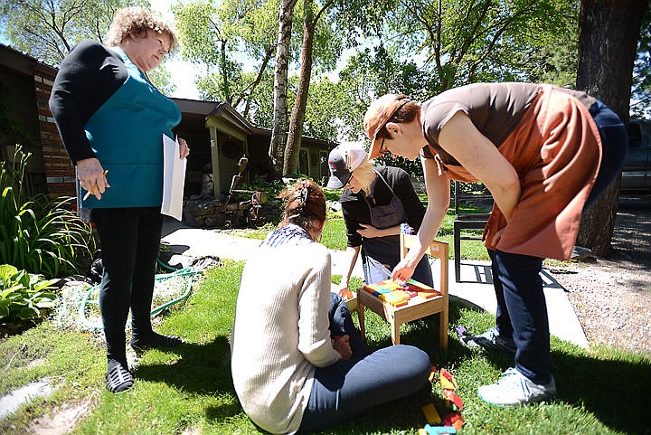 From left: Deb Newell, Kathy Demler, Noelle Birkey and Heather Dennis add puzzle pieces to the seat of a chair they are refurbishing as part of the Lakeside Community Club project “Chair-ish Our Community” on Wednesday, June 15, east of Kalispell. (Brenda Ahearn/Daily Inter Lake)