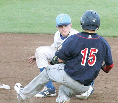 Second baseman Seth Bateman puts the tag on Jacob Scully trying to steal top of fifth inning, second of a doubleheader vs. Bitterroot Bucs June 17. Loggers fall 7-4.
