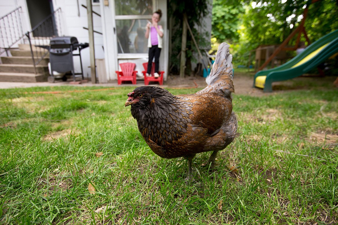 Couch said they have researched Miss Henny Penny's breed and found Americanas to be among some of the most docile birds. The easy-going hen gets along with other neighborhood critters, such as the crows and squirrels, and does well with Couch's other children and pets.