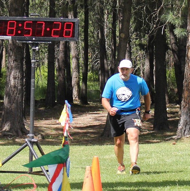 64 year-old, Rich Desimone, comes across the finish line after running in the 50K at the Trail Rail Run in St. Regis on Saturday.