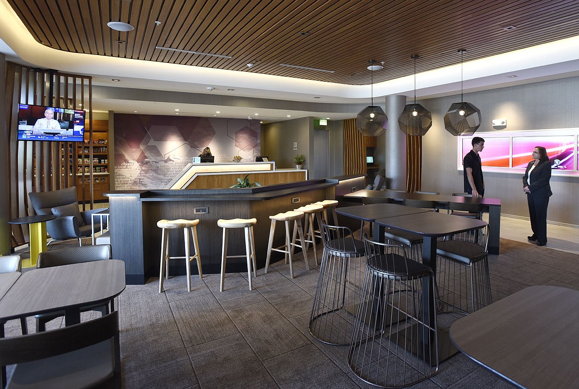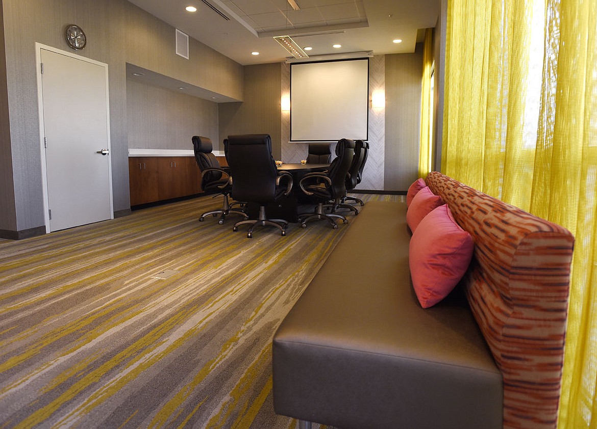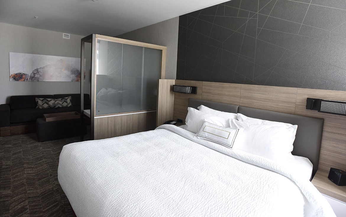 The amenities at the Marriott SpringHill Suites are wide-ranging and include a snack market in the lobby, hot-and-cold complimentary breakfast, fitness room, swimming pool, outdoor patio and a golf putting green. A 24-hour business center enables guests to print their boarding passes from their room and pick them up in the business center on the main floor.