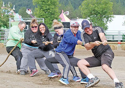 Logger Days adult Tug-o-war with Alan Anderson, left, Sadie Hergesheimer, Jamesina Rawleigh, Alexis Peterson, Paul Kinder and Andy Hergesheimer. (Paul Sievers/The Western News)