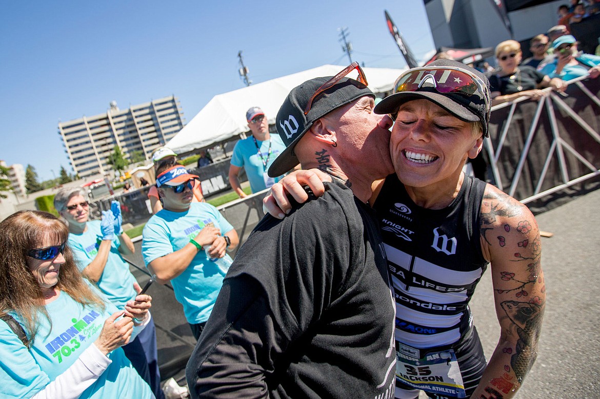 Both Potts and Jackson tacked on another victory in Coeur d’Alene, with Potts having won three full Ironman triathlons here (2010, ’14, ’15) and Jackson winning her first full one in Coeur d’Alene last summer. The 39-year-old Potts, from Colorado Springs, Colo., ran down the final half-mile with his arms spread wide like an airplane, before he jumped through the white banner and into the arms of his wife Lisa, son Boston and daughter Sloane.
