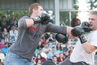 Competitors were required to box each other on top of a giant log surrounded by sawdust. Neither of the competitors could cross the center line.