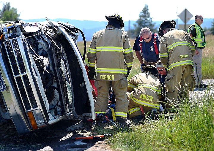 The driver of this pickup truck along U.S. 2 was extricated by members of the Smith Valley and Kalispell fire departments Wednesday afternoon. Both the Flathead County Sheriff’s Office and the Montana Highway Patrol were on scene gathering evidence and redirecting traffic. (Brenda Ahearn/Daily Inter Lake)
