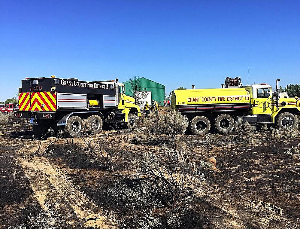 About 2:15 p.m. Grant County Fire District No. 13 responded Monday to a wildland fire in the 5800 block of Road 10.2 Northwest, about seven miles southwest of Ephrata. When crews initially arrived at the scene about 15 acres had burned and a shed was on fire, according to information provided by GCFD No. 13 on Tuesday.