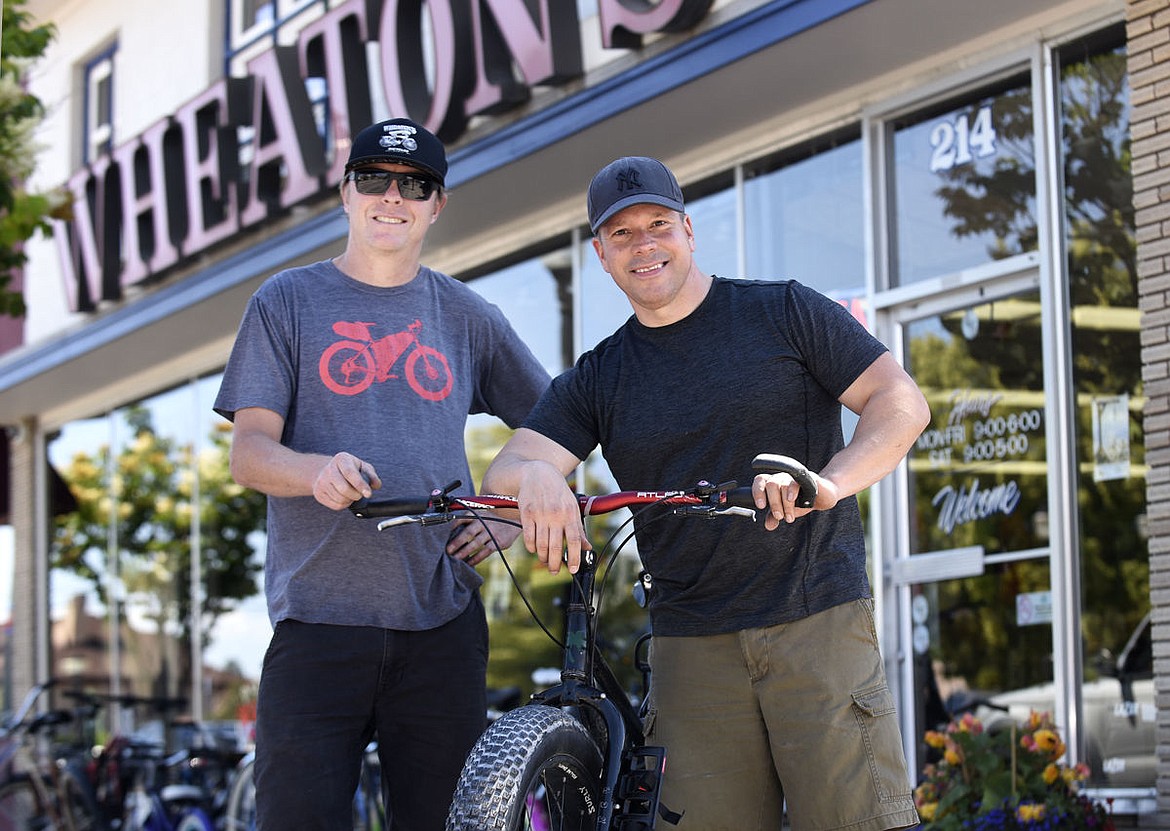 Wheatons manager Hans Axelsen, left, and Mike Potter stand with Potter's recovered fat bike in front of the cycle shop in Kalispell on Wednesday. Mike Potter puts a tire on his fat bike at Wheatons on Wednesday. The bike, which Potter rode across America on, was stolen from him about eight months ago. The bike was recovered after it was brought it to Wheatons to get repaired and Wheatons manager Hans Axelsen recognized it. (Aaric Bryan/Daily Inter Lake)