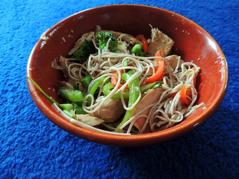 Remove from heat and add sesame seeds. Pour over noodles, toss to cover noodles and chicken mixture. Serve immediately. Makes 6 servings.