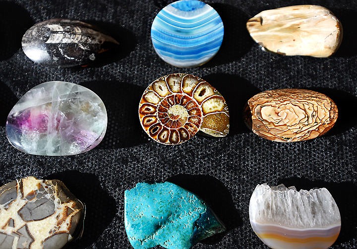A collection of nine stone belt buckles that are part of Steve Eckels' collection. From back to front, left to right the stones are: Trilobite, Brazilian Agate, petrified wood, Fluorite, Ammonite from Madagascar, Deschutes River Jasper, Septarian Nodule from Utah, Chrysocolla, and Brazilian Agate with Crystalized Quartz.