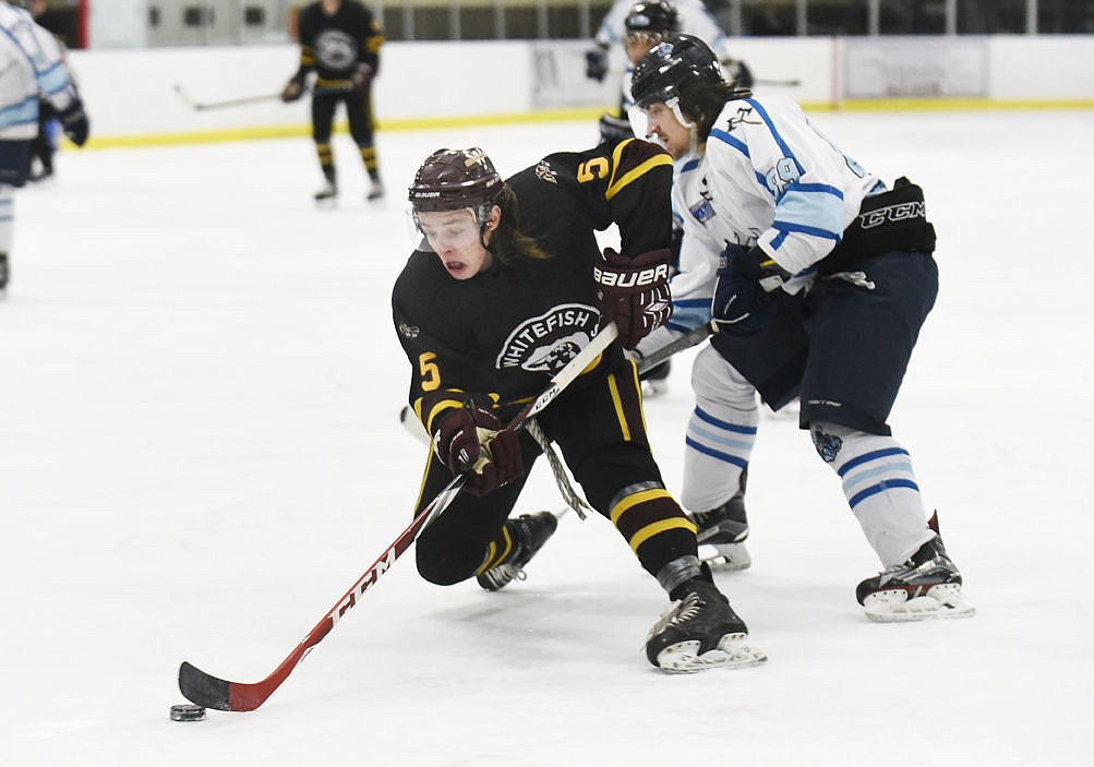 Whitefish Wolverines' Keiffer Helbing skates pass a Lake Tahoe Iceman defender Cameron Serda during the first period of the Wolverines' blowout win at the Stumptown Ice Den on Friday. (Aaric Bryan/Daily Inter Lake)