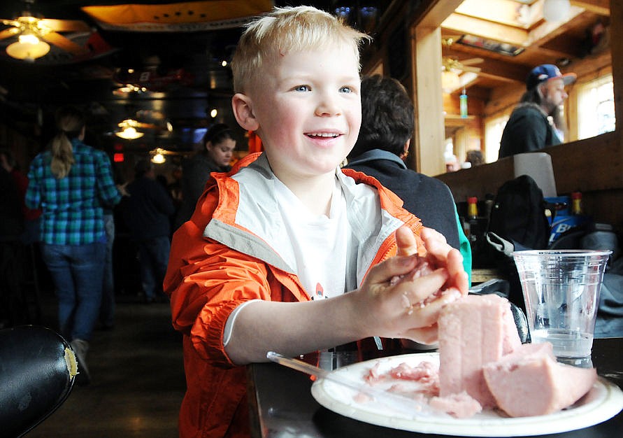 Six-year-old Beckett Schreiber starts sculpting his Spam snowman during the Spam-O-Rama contest of the Bigfork Brewfest at the Garden Bar on Saturday. (Aaric Bryan/Daily Inter Lake)
