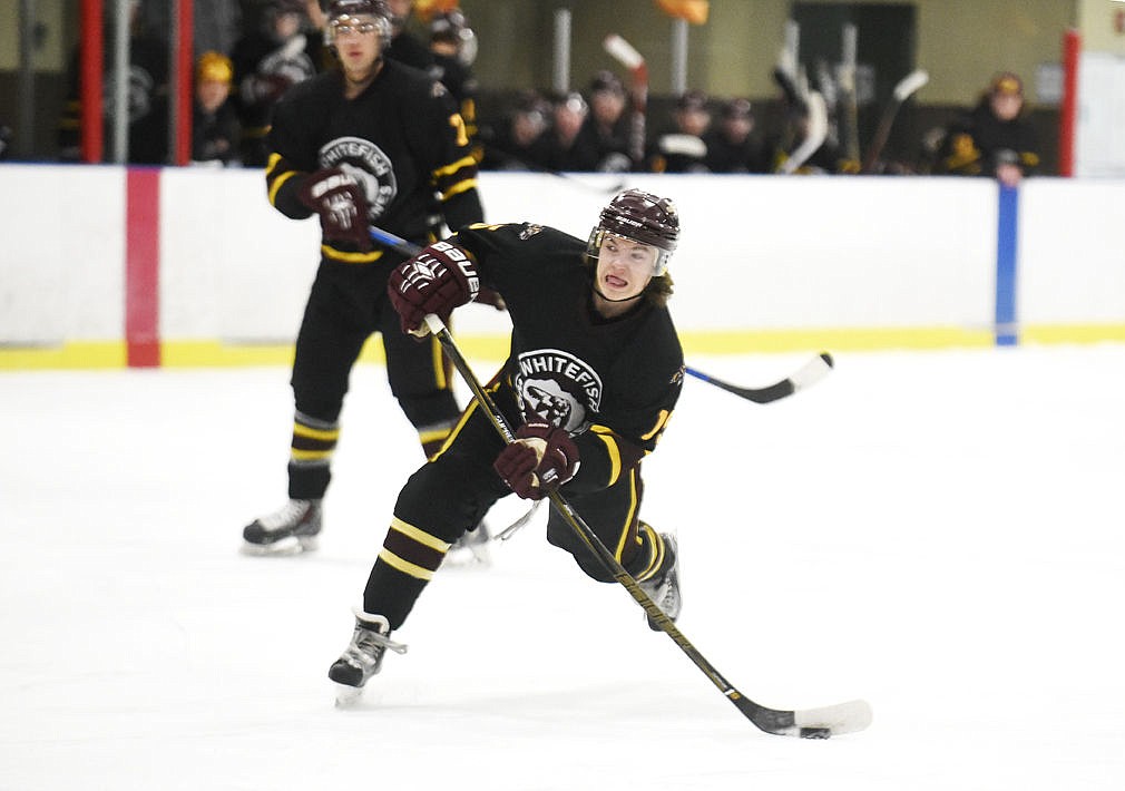 Whitefish Wolverine Johnathan Ball takes a shot during the Wolverines' blowout of the Lake Tahoe Icemen at the Stumptown Ice Den on Friday. Ball had four assists and a goal in the game. (Aaric Bryan/Daily Inter Lake)