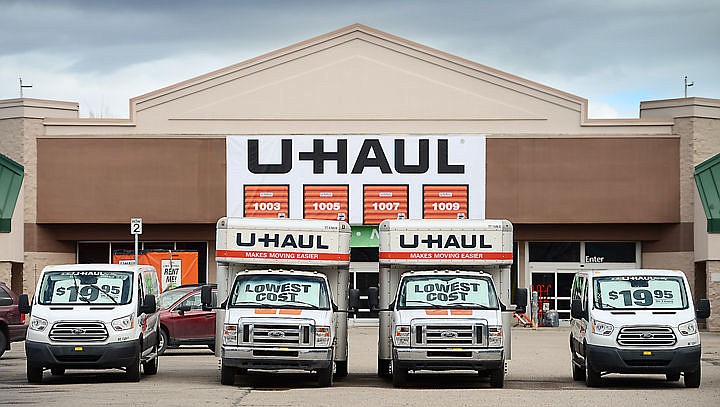 Rental trucks are lined up outside the new U-Haul business in Evergreen on Monday afternoon. U-Haul is moving into the former Walmart building. (Brenda Ahearn/Daily Inter Lake)