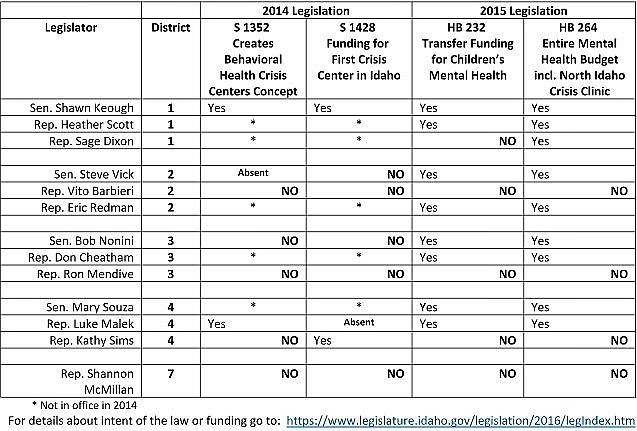 This year, the Legislature will consider funding two more mental health crisis centers, one each in Boise and Twin Falls, through HB 579, which is the entire mental health budget. The chart below shows how North Idaho legislators voted on previous bills, all of which passed overwhelmingly. Stay tuned to HB 579.