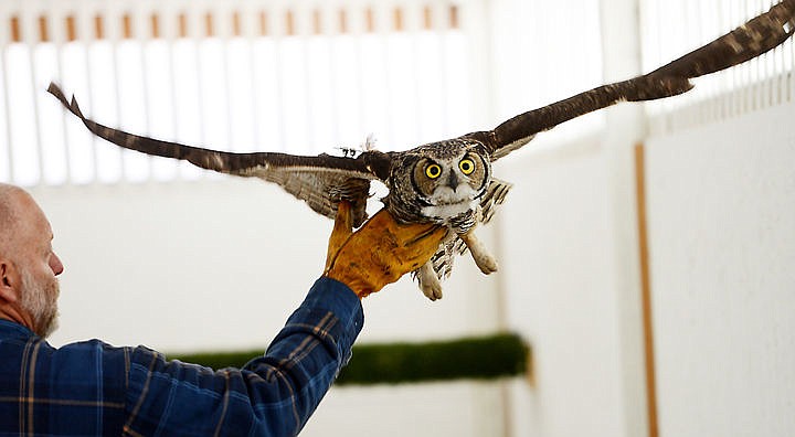 A Great horned owl with a broken wing flies as it recovers on Tuesday, March 15, in Kalispell at Montana Wild Wings Recovery. (Brenda Ahearn/Daily Inter Lake)