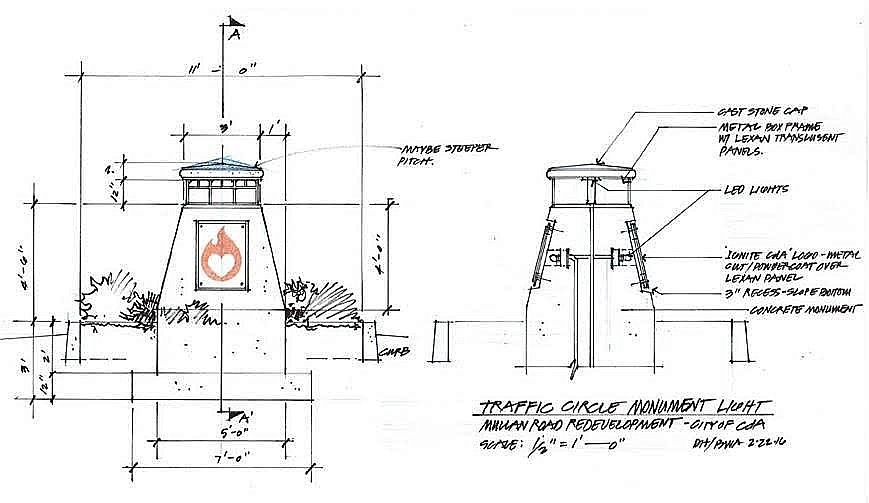 Mayor Steve Widmyer, who serves on ignite's board, said the logo was more of a placeholder than anything. However, the plans are quite specific, from the 3/16-inch-thick, 3-foot-tall steel logo with powdercoat finish mounted over a 1/8-inch-thick Lexan panel to the tamper-resistant screws, white precast stone cap and grading finish thoughtfully illustrated on the blueprint.