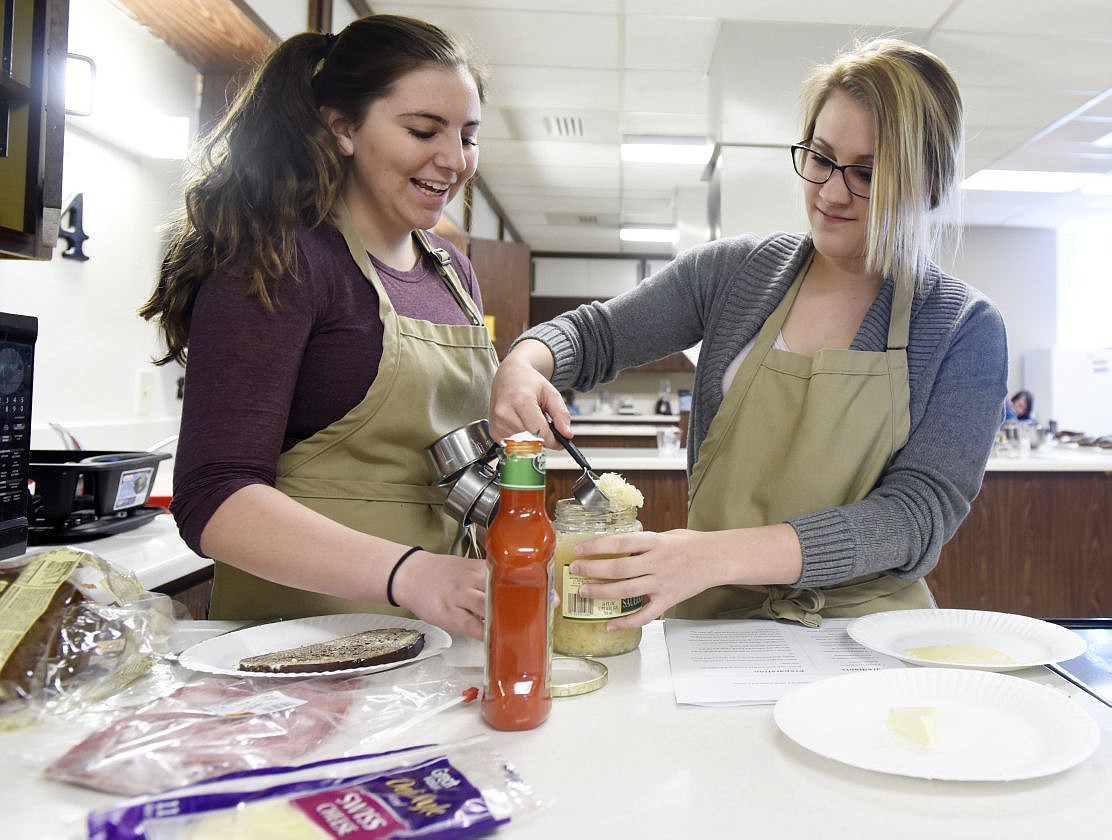 Krysta Reichert, left, and Dana Van Luven measure sauerkraut for a reuben sandwich during a ProStart Culinary class at Flathead High School on Thursday. (Aaric Bryan/Daily Inter Lake)