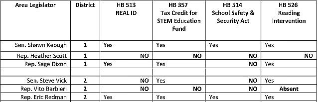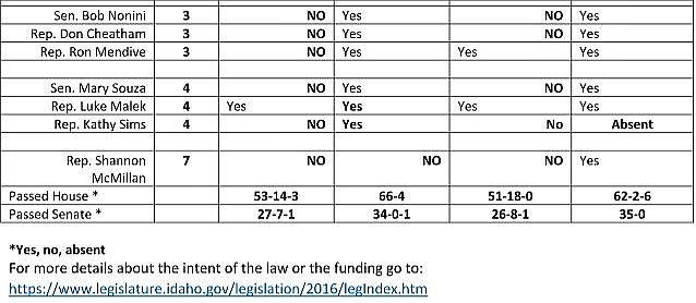 • HB 451 — Requires schools to work with parents and provide notification when kindergarten-third-graders aren’t reading at grade level. Develops an improvement plan for the near 37,000 deficient readers and makes parents full partners in helping the child read proficiently. Annual reports will be required from the State Department of Education to determine if intervention efforts are effective. Approved unanimously by area legislators and a win for Idaho’s children — overwhelming support in both houses so not included in chart below.