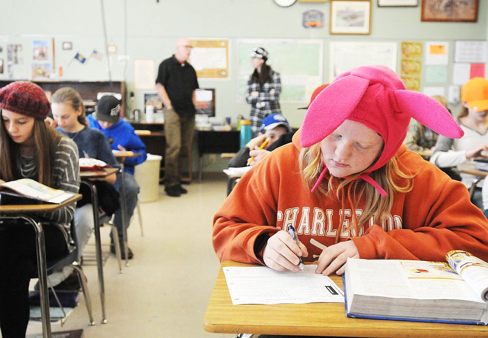 Somer's seventh-grader Shelby Daniels wears a hat for a fundraiser as she does her assignment during Tom Gillespie's history class at the middle school on Wednesday.