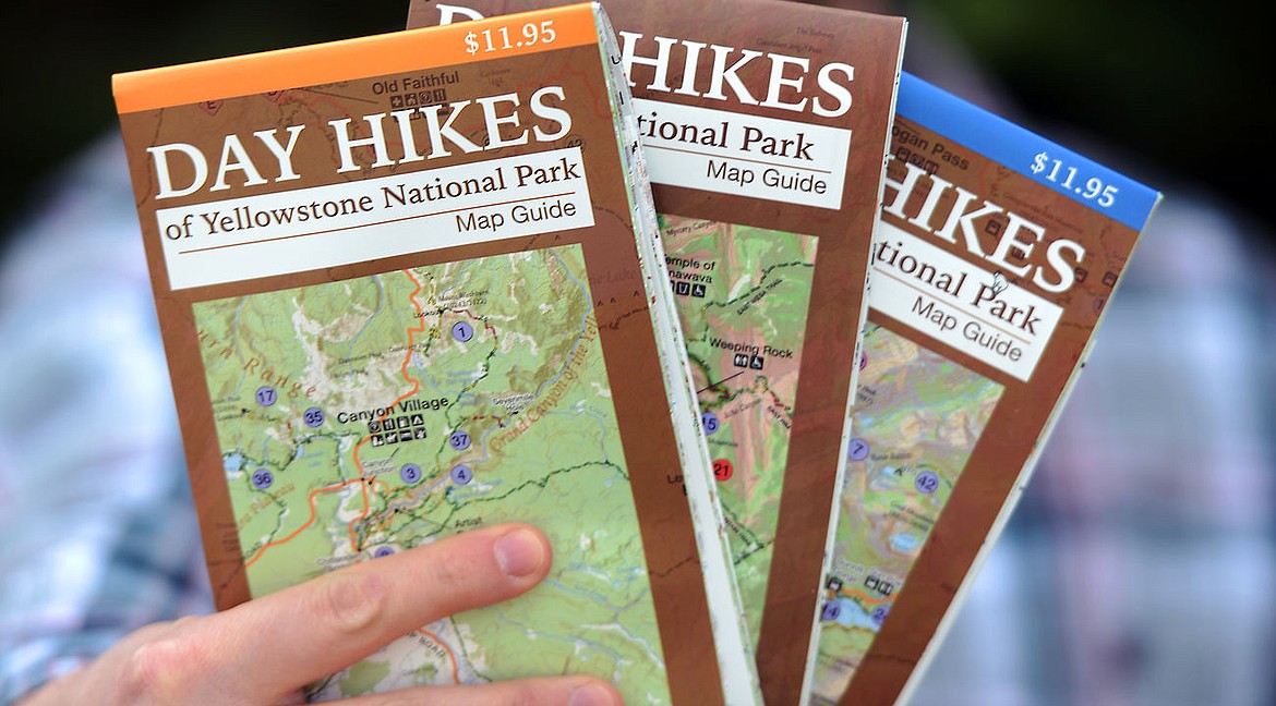 Detail of the three Day Hikes maps by Jake Bramante featuring Yellowstone, Glacier and Zion. (Brenda Ahearn/Daily Inter Lake)