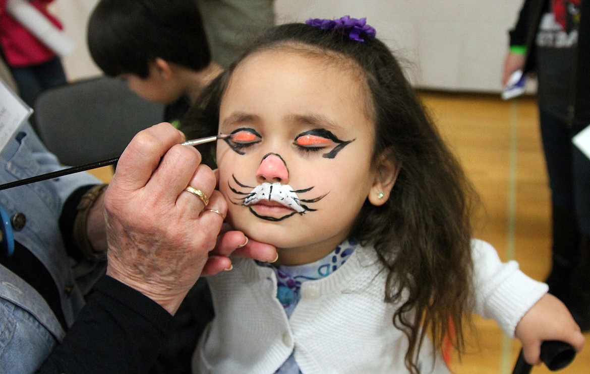 The nose and whiskers had already been applied and her tiny face framed with jet black hair began to take the shape of a cat as she patiently sat in the chair undergoing the process. Her tiny hand clutched the arm of the chair as the face painter worked around her eyes. First the highlight on the corners of her eyes, big and brown, ones that would dazzle the boys in years to come. Then the highlight accenting the peach coloring on her eyelids, same as the button nose.