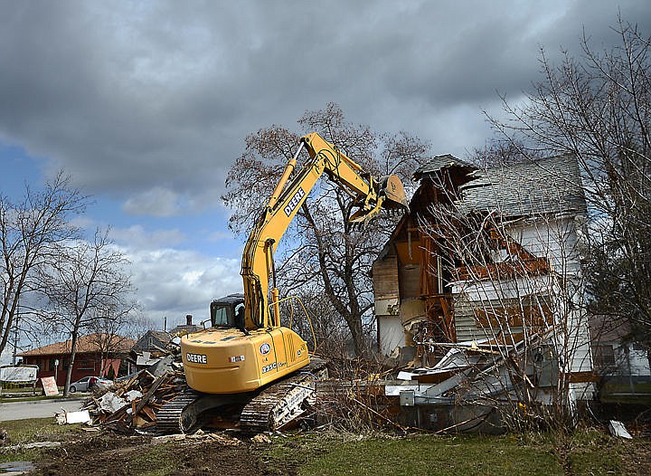 Demolition of a house on 5th Avenue West was in full swing Monday afternoon, March 21, in Kalispell. The property is slated to become a new shelter for women and children. (Brenda Ahearn/Daily Inter Lake)