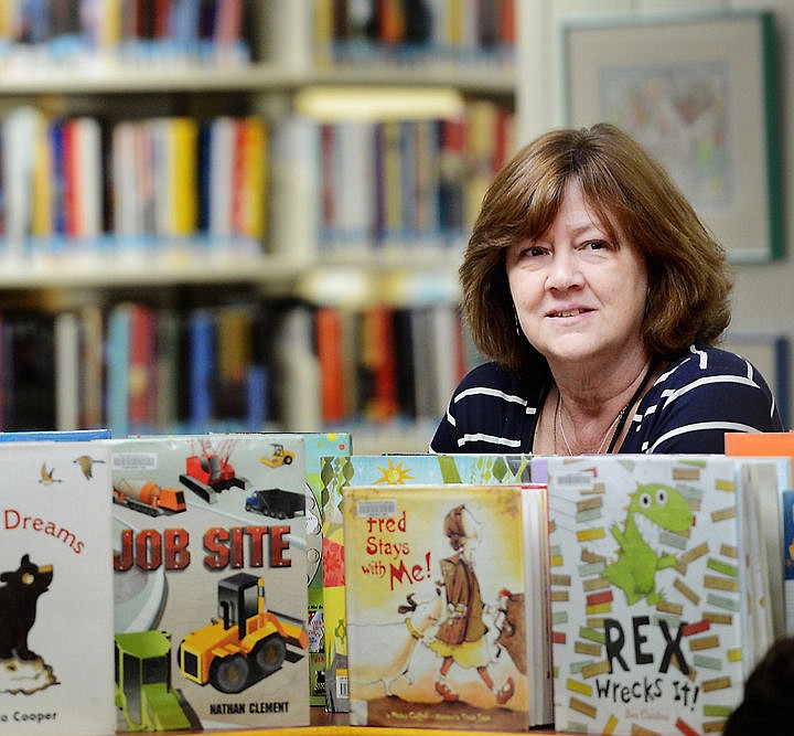 Library Director Kim Crowley looks over the bookshelves into Storytime on Tuesday, March 22, at ImagineIF Library in Kalispell. (Brenda Ahearn/Daily Inter Lake)
