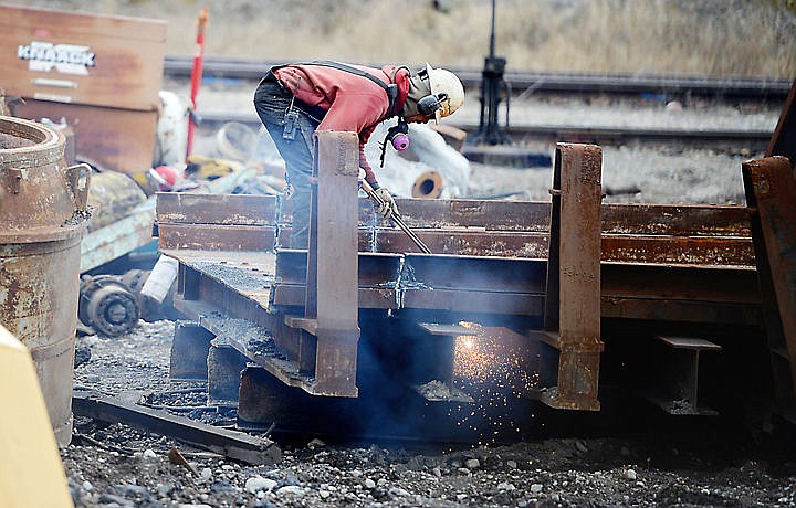 A worker uses a torch to cut through materials being recycled at the Columbia Falls Aluminum Co. plant on Thursday. (Brenda Ahearn/Daily Inter Lake)