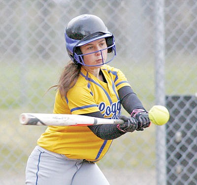 Madisen Monigold with a base hit bottom of first inning vs. Eureka. Lady Loggers prevail 13-2 in five innings, 4-11-15.