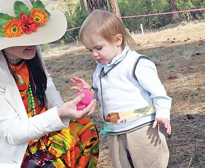 Eighteen-month-old River Ehrlich checks his Easter egg. Libby Christian Church egg hunt.