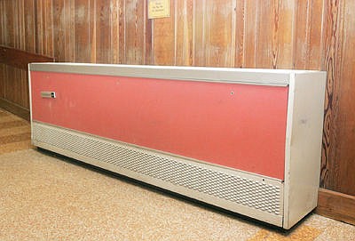 Heater in hallway of elementary school. Heaters are so old that spare parts are no longer available.