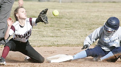 Kaylee Tunison covering second base during first game of a doubleheader vs. Bonners Ferry Friday. Lady Trojans fall to Lady Badgers 0-18 and 2-12.