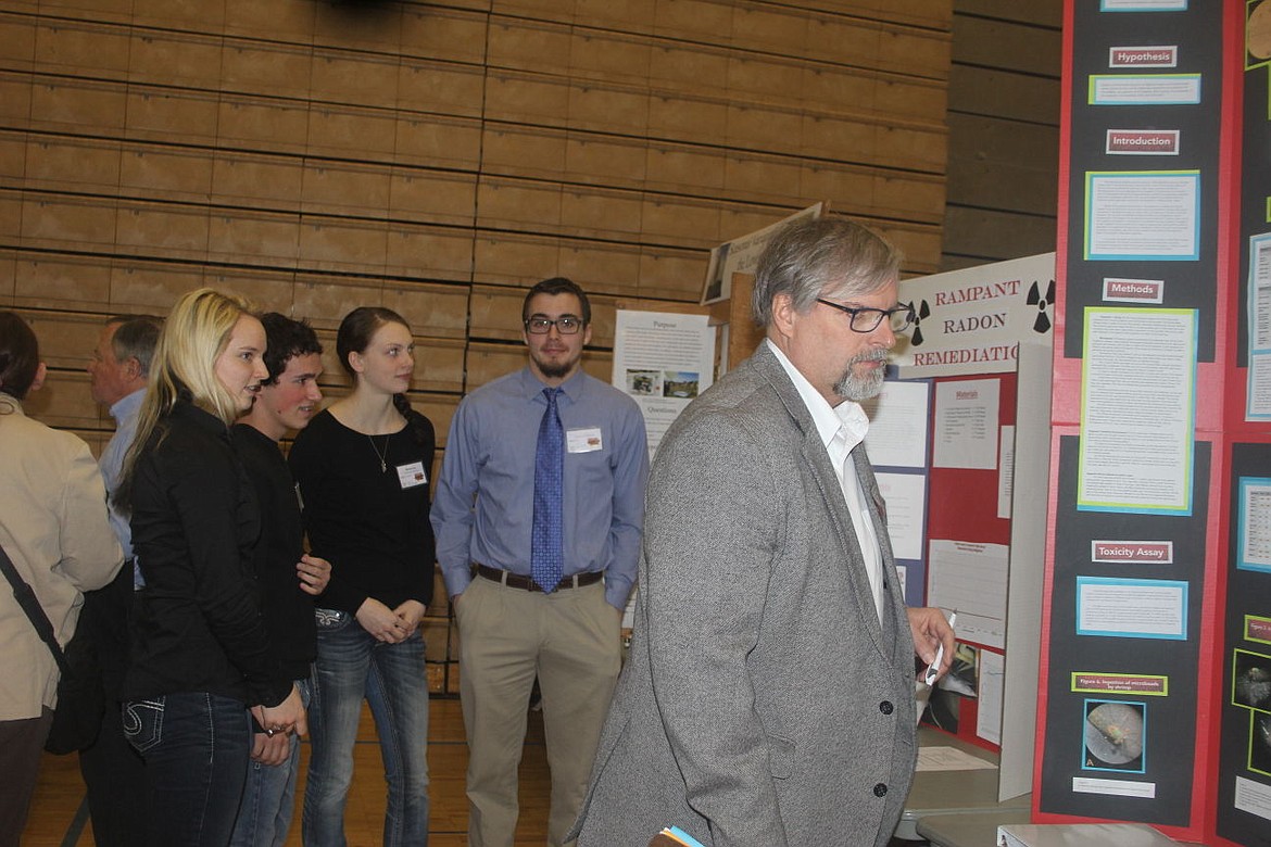 Superior team members Emma Duboise, Taryn Ververis, Marissa Koke, and Aaron Kelly, watch as a judge looks at their science project “Rampant Radon Remediation” at the State Science Fair held at the University of Montana in Missoula on March 21.