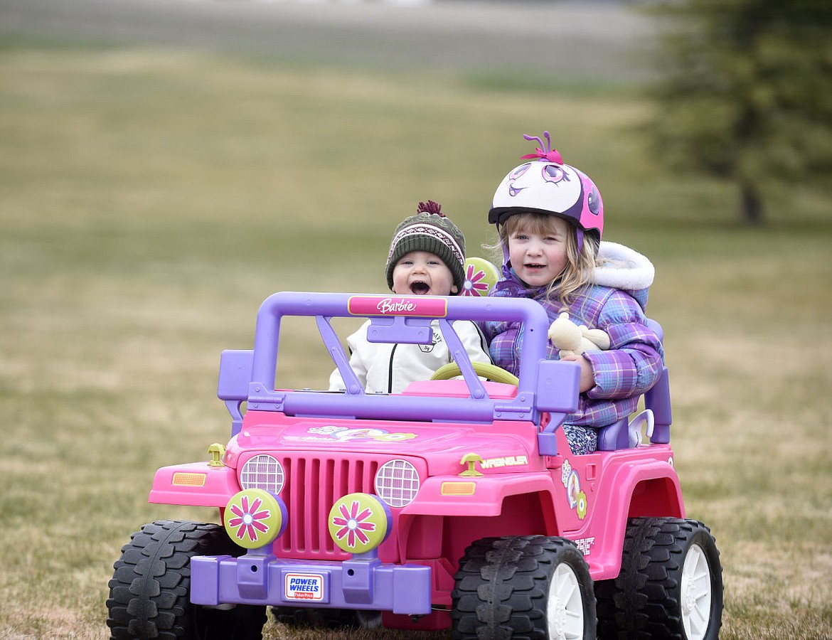 Ariella Rasmussen drives Emmett Merrill around in her Barbie Jeep Wrangler Power Wheel she just got for her third birthday in Creston on Wednesday.
