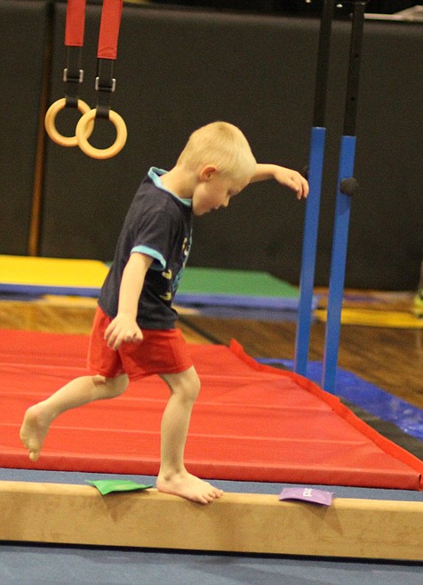 Dominic Mancini, 3, gives the practice beam a try at gymnastics in the St. Regis School gym.