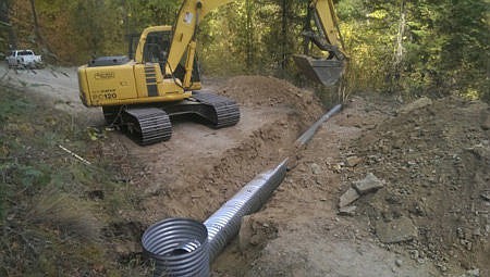 Culvert installation along a haul route for the Firecracker Annie project in Mineral County. The road work was awarded to two local contractors using Forests In Focus grant funds