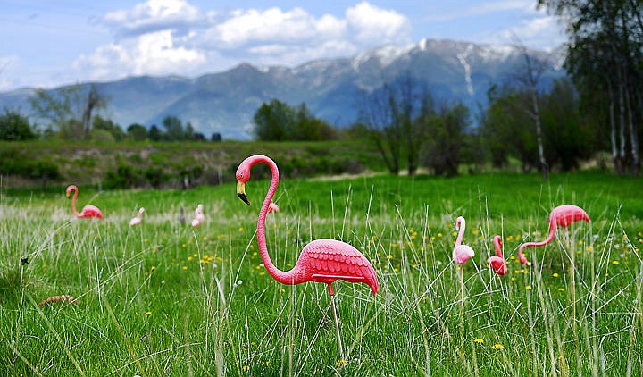 A field of pink flamingos add bright spots of color to a field off of Holt Stage Road east of Kalispell. The flamingos are a welcome to spring planted by Jim Lackey and his six-year-old daughter Carys Lackey. (Brenda Ahear/Daily Inter Lake)