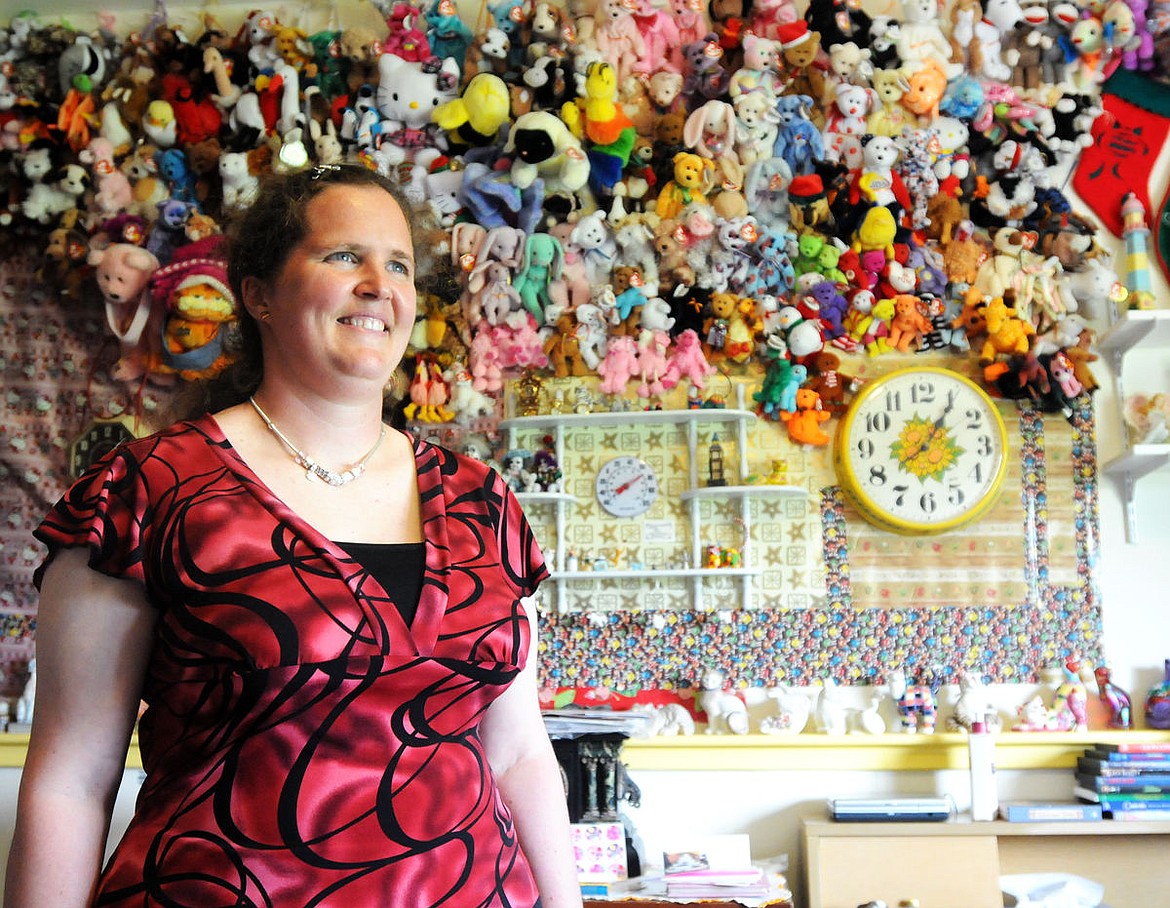 Leanne Shephard stands in front of her collection of stuffed animals and clocks in her room at the Lighthouse Christian Home in Somers on Thursday. There will be a reception for Shephard's artwork at the Bigfork Art and Cultural Center on Friday. (Aaric Bryan/Daily Inter Lake)
