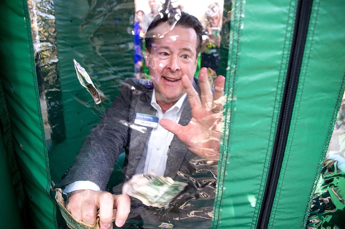 In a spirit of friendly competition, Coeur d’Alene Mayor Steve Widmyer, Hayden Mayor Steve Griffitts, Dalton Gardens Mayor Steve Roberge and Post Falls Mayor Ron Jacobson took turns scrambling to collect as many bills as possible in an inflatable cash machine, provided by Idaho Central Credit Union.