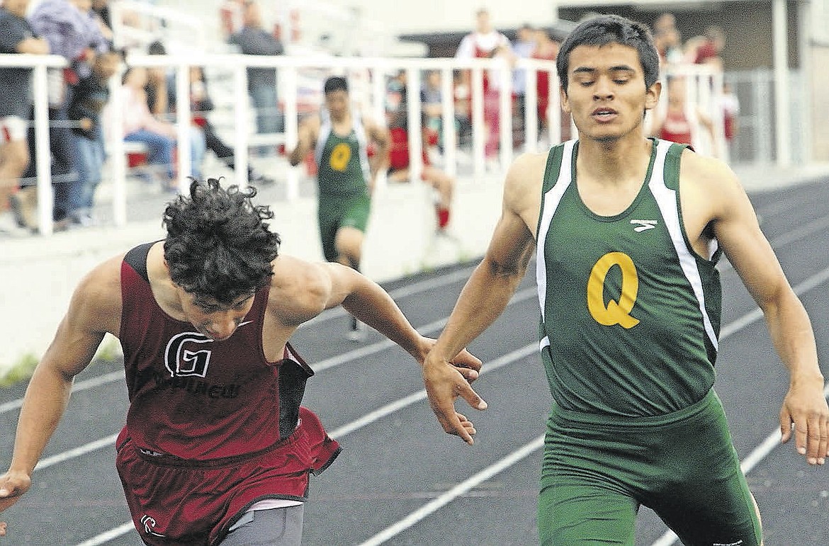 Quincy senior Luis Camacho and David Barajas of Grandview knifed through a gusting headwind in a showcase of competitive talent Thursday afternoon at the Central Washington Athletic Conference track and field meet in Othello. Camacho and Barajas came off the final curve stride-for-stride.