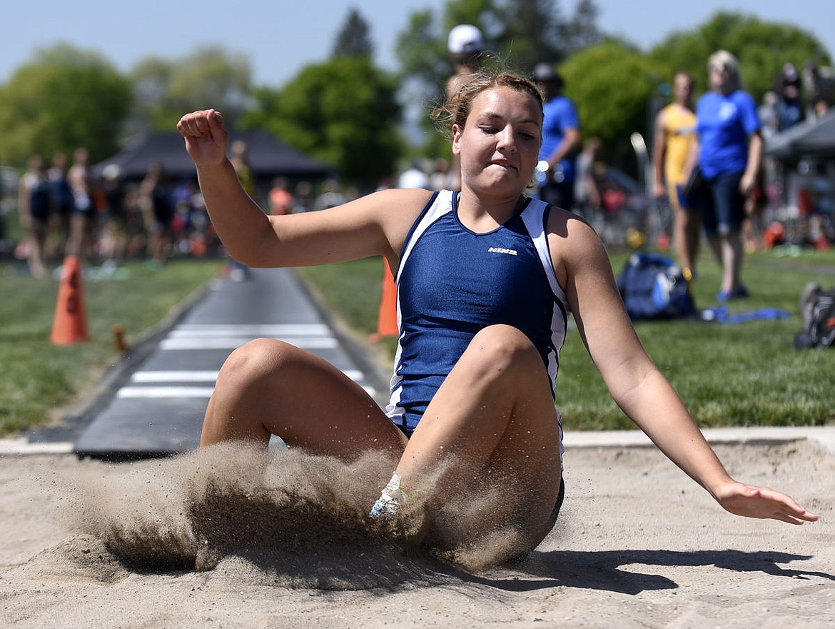 Glacier senior Taylor Salonen lands in the sand during the triple jump at the Archie Roe Invitational on Saturday, May 7. (Aaric Bryan/Daily Inter Lake)