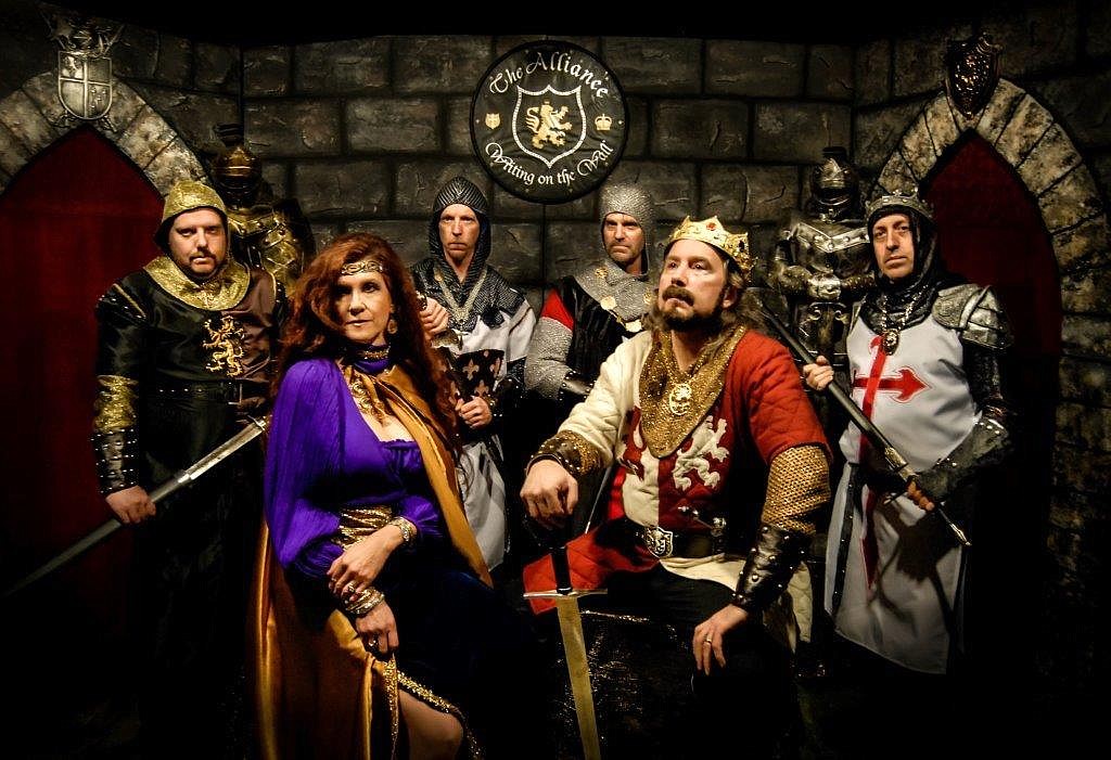 The band features two guitars, a bass, drums and keyboard, which Trocke's wife, Colleen, plays. Alliance members assume personas when on stage. Jay is King James, and his wife, Queen Colleen. The other musicians dress as knights.