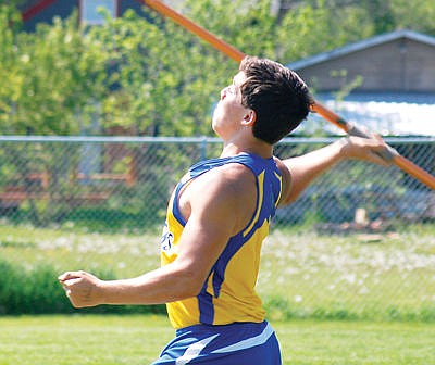 Clancy Gout throwing the javelin, Archie Roe track meet.
