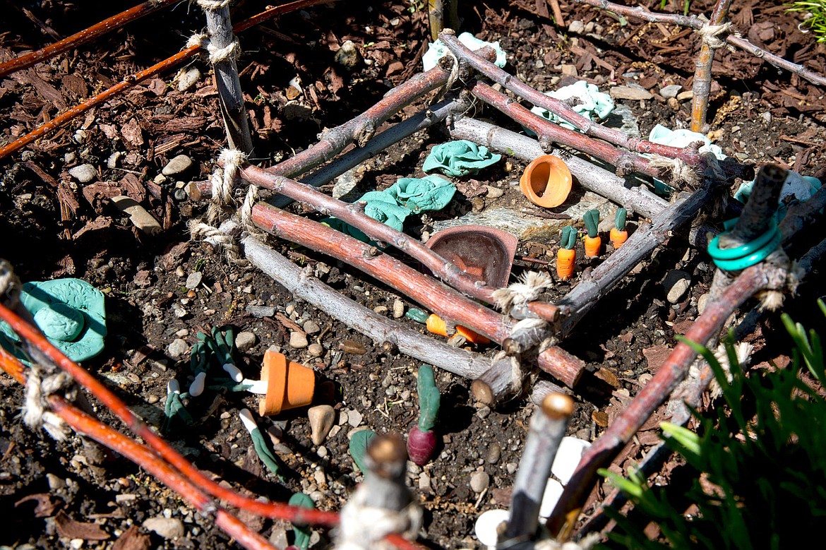 A tiny swing dangles from a tiny tree, a miniature birdcage hangs from a miniature branch and a fairy-sized vegetable garden is filled with little carrots, cabbage, beets and cauliflower that Linda fashioned out of clay.