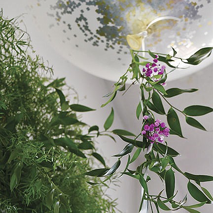 Take strand of green leaves and wrap greenery around string, starting at the balloon stem.