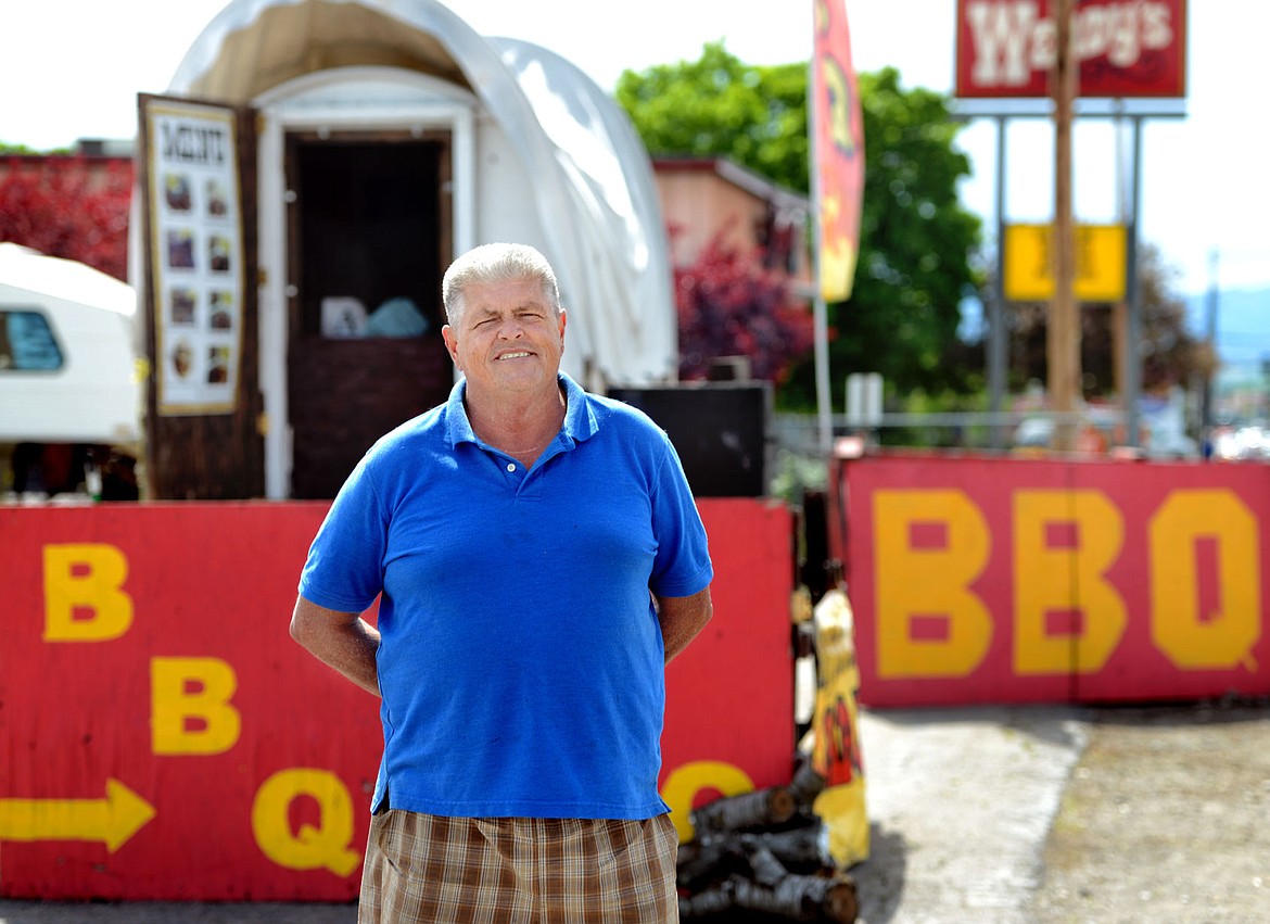 Michael Findley outside his BBQ wagon located in the parking lot of the Blue and White Motel in Kalispell in the 600 block of East Idaho on Tuesday, May 10. (Brenda Ahearn/Daily Inter Lake)